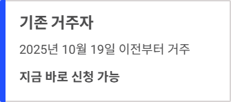 - 기존 거주자 ('25. 10. 19. 이전부터 거주): 지금 바로 신청 가능 (~1. 30. 마감)