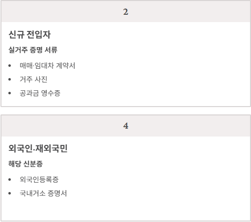- 예: 매매·임대차 계약서, 거주 사실 증명 사진, 공과금 영수증 등