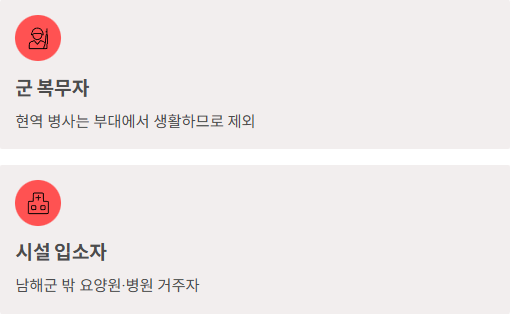 - 남해군 밖에 있는 요양원, 요양병원 등의 시설에 계신 분들도 제외됩니다.