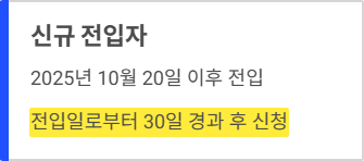 - 신규 전입자 ('25. 10. 20. 이후 전입): 전입 신고일로부터 30일이 지난 후부터 신청 가능