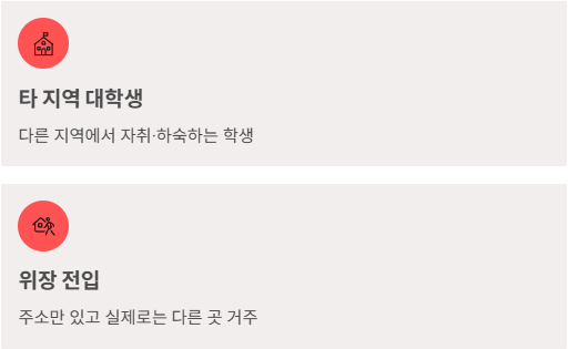 - 학교 때문에 서울, 부산 등 다른 지역에서 하숙이나 자취를 하는 대학생은 실거주자가 아니므로 받을 수 없습니다.