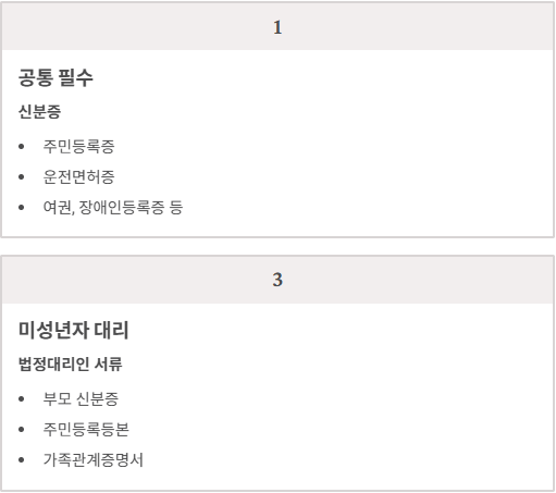 - 신분증 (주민등록증, 운전면허증, 여권, 장애인등록증 등)