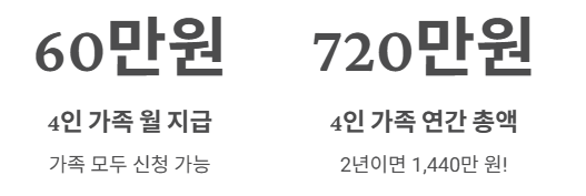 4인 가족 기준으로 1년이면 총 720만 원입니다. 생활비 방어에 정말 큰 도움이 되는 금액이니 빠짐없이 챙겨야 합니다.