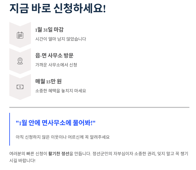 여러분의 빠른 신청이 활기찬 정선을 만듭니다. 잊지 말고 꼭 챙기시길 바랍니다.