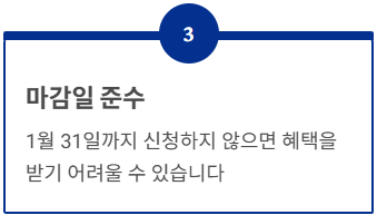 1월 31일(토)까지 신청하지 않으면 지급이 늦어지거나 신청 절차가 복잡해질 수 있습니다.
