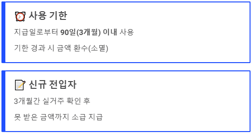 지급일로부터 90일(3개월) 이내에 사용해야 합니다. 기한이 지나면 금액이 환수(소멸)됩니다.