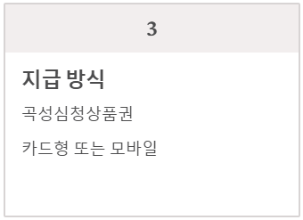 - 지급 수단: 곡성심청상품권 (카드형 또는 모바일)