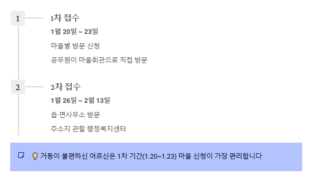 | 1차 접수 | 1. 20.(화) ~ 1. 23.(금) | 마을별 방문 신청 | 공무원이 마을회관 등으로 방문 |