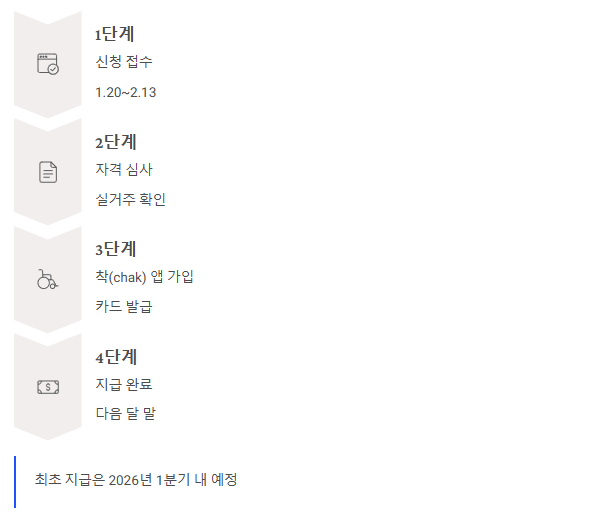 - 원칙: 신청 다음 달 말 지급. (최초 지급은 2026년 1분기 내 예정)