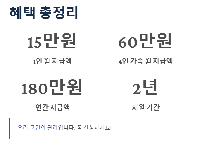 - 월 15만 원, 4인 가족 월 60만 원의 큰 혜택입니다.