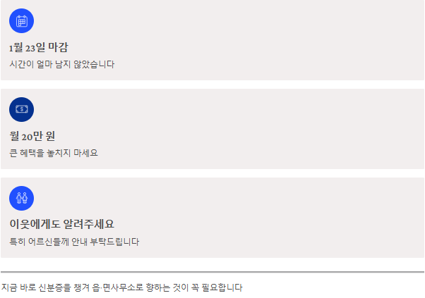 이웃 어르신들께도 "23일 끝나기 전에 면사무소 가보세요!"라고 꼭 알려주세요.