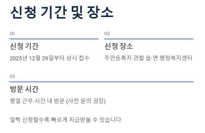 - 신청 장소: 주민등록지 관할 읍·면 행정복지센터