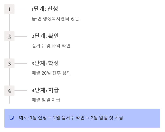 - 예: 1월에 신청 → 2월 중 실거주 확인 → 2월 말일 첫 지급