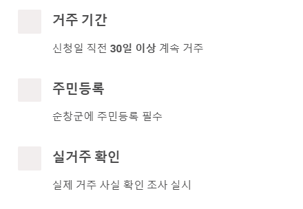 - 신청 대상: 신청일 직전 30일 이상 계속해서 순창군에 주민등록을 두고 실제 거주하는 군민