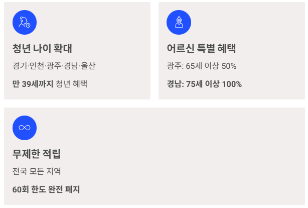 | 어르신 혜택 | 만 65세 이상 20~30% | 광주: 65세 이상 50% 경남: 75세 이상 100% (무료) |