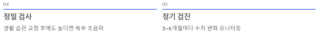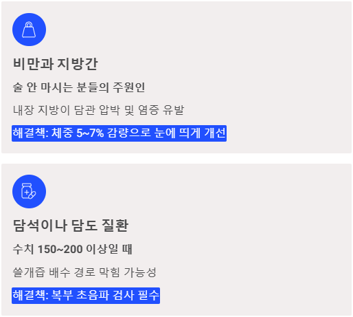 - 생활 습관을 고쳤는데도 수치가 계속 높다면, 담석증 검사(초음파)를 꼭 받아보셔야 합니다.
