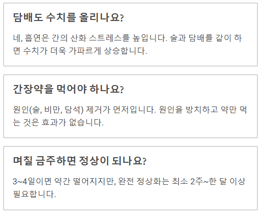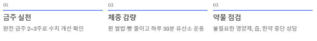 - 수치가 높다면 1순위로 술을 끊고, 술을 안 마신다면 체중을 줄이거나 먹는 즙/약을 점검해야 합니다.