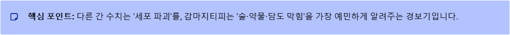쉽게 말해, 다른 간 수치(AST, ALT)가 '간세포 파괴'를 보여준다면, 감마지티피는 '술, 약물, 그리고 담도(쓸개 길)의 막힘'을 가장 예민하게 알려주는 경보기입니다.