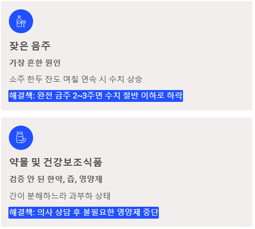 - 해결 방법: 가장 확실한 방법은 '완전 금주'입니다. 술을 끊고 2~3주만 지나도 수치가 절반 이하로 뚝 떨어지는 것을 볼 수 있습니다. 만약 술 때문이라면 회복이 아주 빠른 편이니 안심하고 금주를 실천하세요.