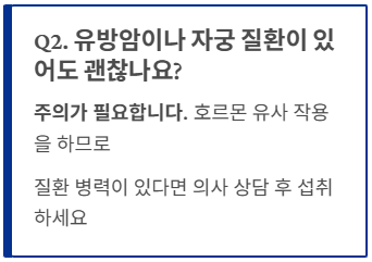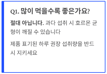 - 여성 질환 병력이 있다면 섭취 전 전문가와 상의하는 것이 가장 안전한 방법입니다.