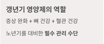 - 갱년기 영양제는 증상 완화뿐 아니라 노년기 뼈와 혈관 건강을 지키는 중요한 수단입니다.