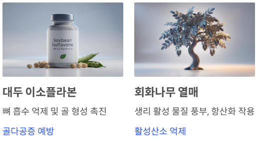 | 대두 이소플라본 | 뼈 흡수 억제 및 골 형성 촉진 | 뼈가 약해지거나 골다공증 가족력이 있는 분 |