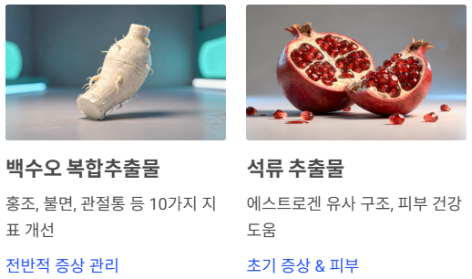 | 석류 추출물 | 에스트로겐 유사 구조, 피부 건강 도움 | 초기 증상 완화와 피부 탄력을 함께 챙길 분 |