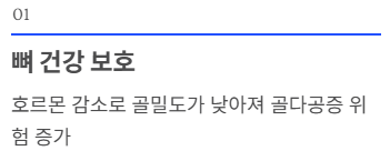 - 뼈 건강 보호: 여성 호르몬은 뼈를 튼튼하게 유지하는 역할을 합니다. 호르몬이 줄면 골밀도가 급격히 낮아져 골다공증 위험이 커지므로 관리가 필수입니다.