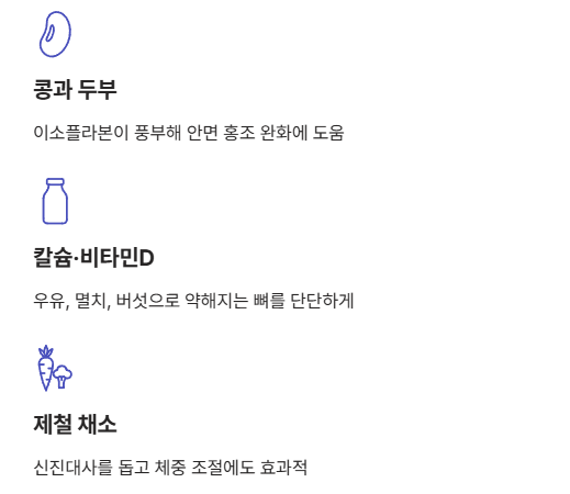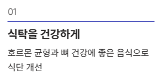 기름진 음식은 피하고 호르몬 균형과 뼈 건강에 좋은 음식을 챙겨 드시는 것이 꼭 필요합니다.