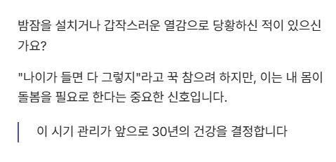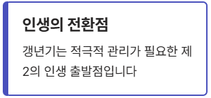 - 갱년기 증상은 단순 노화가 아닌 적극적인 관리가 필요한 제2의 인생 출발점입니다.