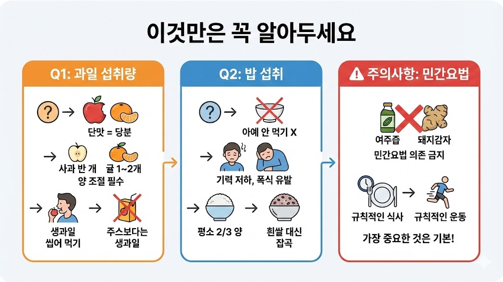 | 과일 섭취 | 식후 바로 먹기, 갈아서 마시기 | 식사와 식사 사이 간식으로, 껍질째 씹어 먹기 |