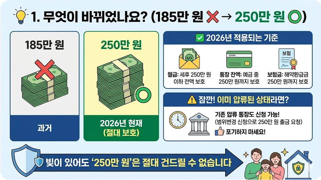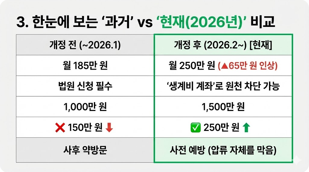 가장 중요한 변화는 보호 금액의 확대입니다. 이제 월 250만 원까지는 그 누구도 압류할 수 없습니다.