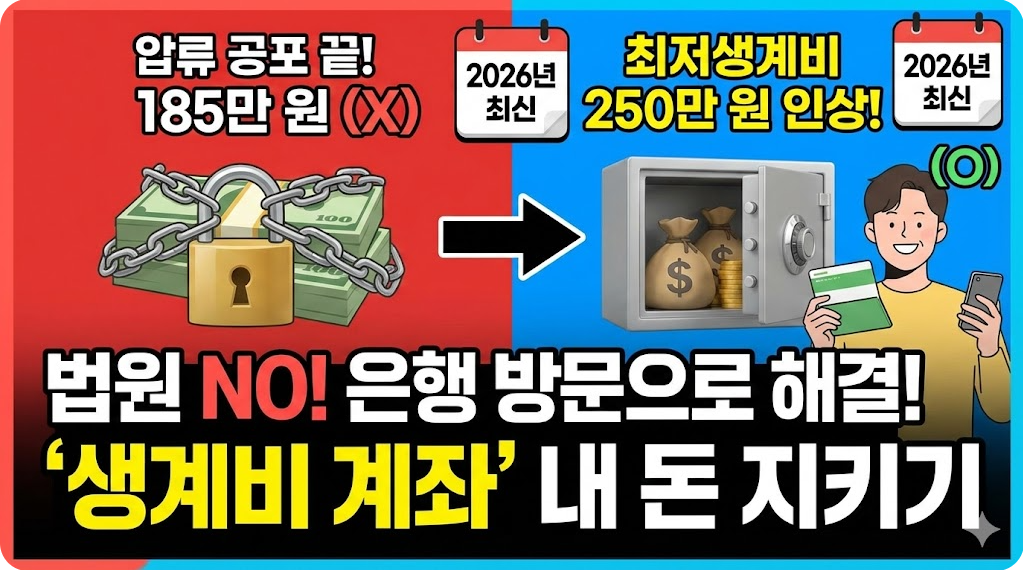 2026년 더 이상 185만 원이 아닙니다. 이제 법적으로 월 250만 원까지 압류가 전면 금지됩니다. 특히 복잡한 법원 절차 없이 은행 방문만으로 해결 가능한 '생계비 계좌' 제도가 신설되었습니다. 내 돈을 지키는 가장 최신 방법을 지금 확인하세요.