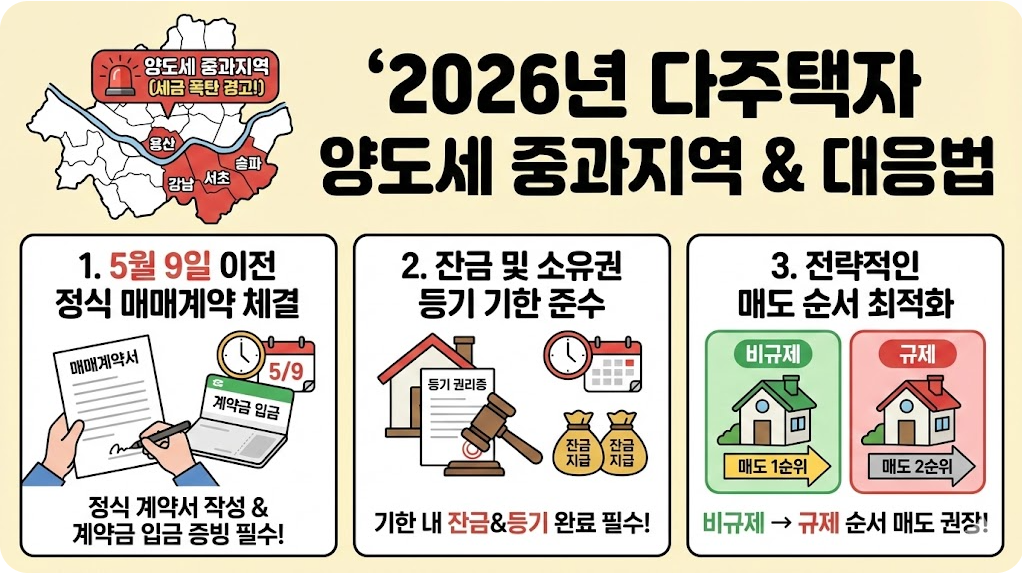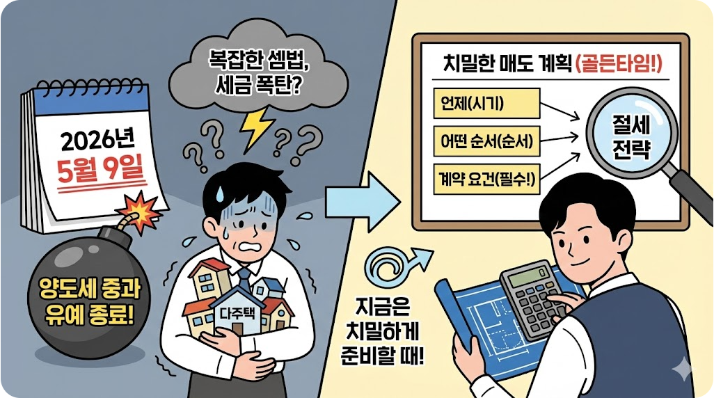 2026년 5월 9일 한시 유예 조치가 종료됨에 따라 다주택자 양도세 중과지역 내 주택 매도 시 세금 부담이 급증할 예정입니다. 강남 3구와 용산구 보유자라면 계약 요건과 매도 순서를 지금 확인하세요.