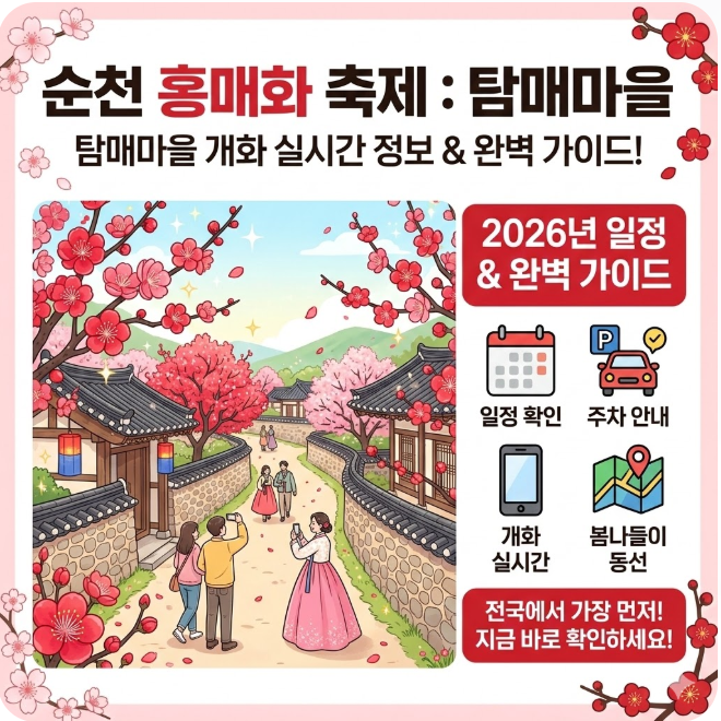 2026년 순천 홍매화 축제 일정, 주차, 탐매마을 개화 실시간 정보 완벽 가이드! 전국에서 가장 먼저 붉게 피어나는 매곡동 봄나들이 동선을 지금 바로 확인하세요.