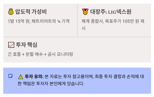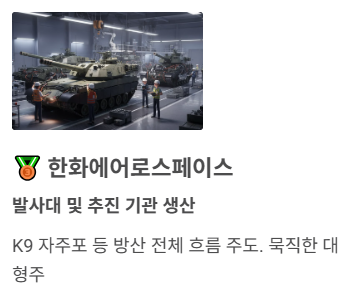 | 한화에어로스페이스 | 발사대 및 차량 생산 | 미사일을 싣고 다니며 쏘는 '발사대'와 추진 기관을 만듭니다. K9 자주포 등 다른 방산 무기 수출과 겹쳐 방산주 전체의 흐름을 주도하는 묵직한 종목입니다. |