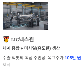 | LIG넥스원 | 천궁2 체계 종합 및 미사일(유도탄) 생산 | 명실상부한 대장주. UAE, 사우디, 이라크 수주 잭팟의 주인공입니다. 최근 증권가에서는 중동 방공 수요 증가에 따라 목표 주가를 105만 원 선까지 올려 잡기도 했습니다. |