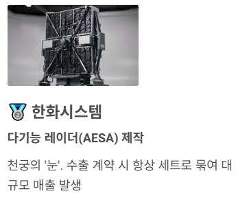 | 한화시스템 | 다기능 레이더(AESA) 제작 | 천궁의 '눈'을 담당합니다. 적의 미사일을 탐지하고 추적하는 핵심 장비로, 천궁 수출 계약 시 항상 세트로 묶여 대규모 매출이 발생합니다. |