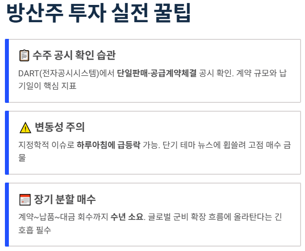 💡 4. 주식 초보를 위한 방산주 투자 실전 꿀팁 및 주의사항