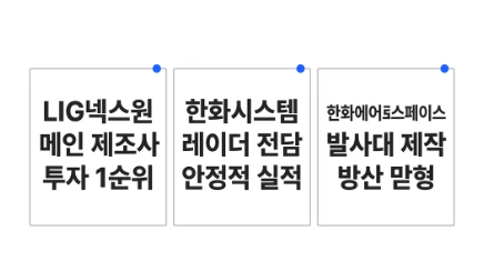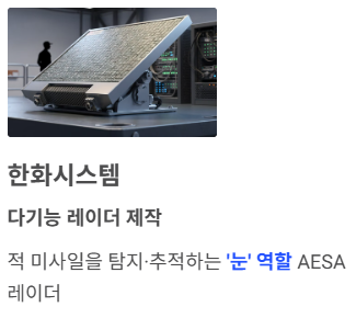 | 한화시스템 | 다기능 레이더(눈 역할) 제작 | 적의 미사일을 재빨리 탐지하고 추적하는 가장 중요한 센서(AESA 레이더)를 만듭니다. |