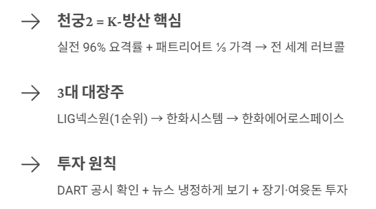 미국 패트리어트 대비 뛰어난 가성비와 최근 실전 90% 이상의 완벽한 요격률로 중동의 하늘을 지키는 천궁2! 핵심 제조사인 LIG넥스원, 한화시스템, 한화에어로스페이스는 K-방산 수출 랠리의 주역으로 든든한 중장기 투자처입니다.