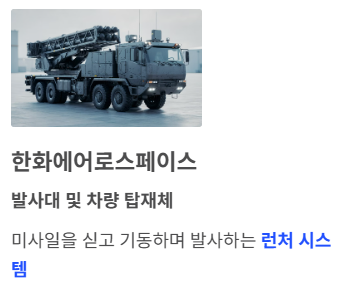 | 한화에어로스페이스 | 발사대 및 차량 탑재체 생산 | 미사일을 싣고 다니며 쏠 수 있게 해주는 거대한 기동 발사대 장비를 책임집니다. |