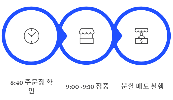 가지고 있는 주식을 한 번에 다 팔지 말고, 두 번이나 세 번에 나누어 파는 방법이 가장 현명합니다. 예를 들어 9시 5분에 절반을 팔고, 주가가 더 오르는지 지켜본 뒤 9시 30분에 나머지를 파는 식입니다. 이렇게 하면 주가가 갑자기 떨어질 때의 위험을 크게 줄일 수 있습니다.