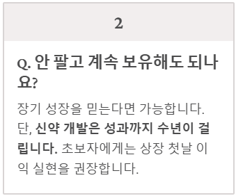 장기적으로 회사가 튼튼하게 성장할 것이라고 믿는다면 계속 보유하셔도 됩니다. 하지만 신약 개발 회사는 눈에 띄는 성과가 나오기까지 아주 오랜 시간이 걸립니다. 따라서 초보자라면 상장 첫날 적당한 이익을 보고 파는 것을 더욱 권장합니다.
