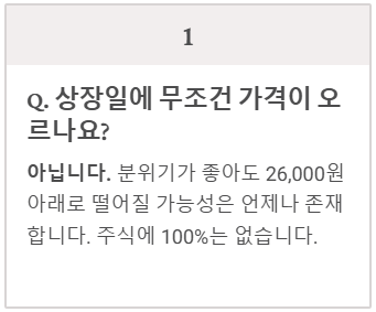 아닙니다. 최근 주식 시장의 분위기가 좋더라도, 상장 첫날 사람들의 기대와 달리 주가가 처음 정해진 가격인 26,000원 아래로 떨어질 위험도 분명히 존재합니다. 주식 시장에는 절대적인 100%가 없다는 것은 확인된 사실입니다.