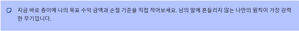 - 한 번에 거래하지 말고 나누어 사고팔며, 본인만의 명확한 가격 기준을 지키는 것이 가장 중요합니다.