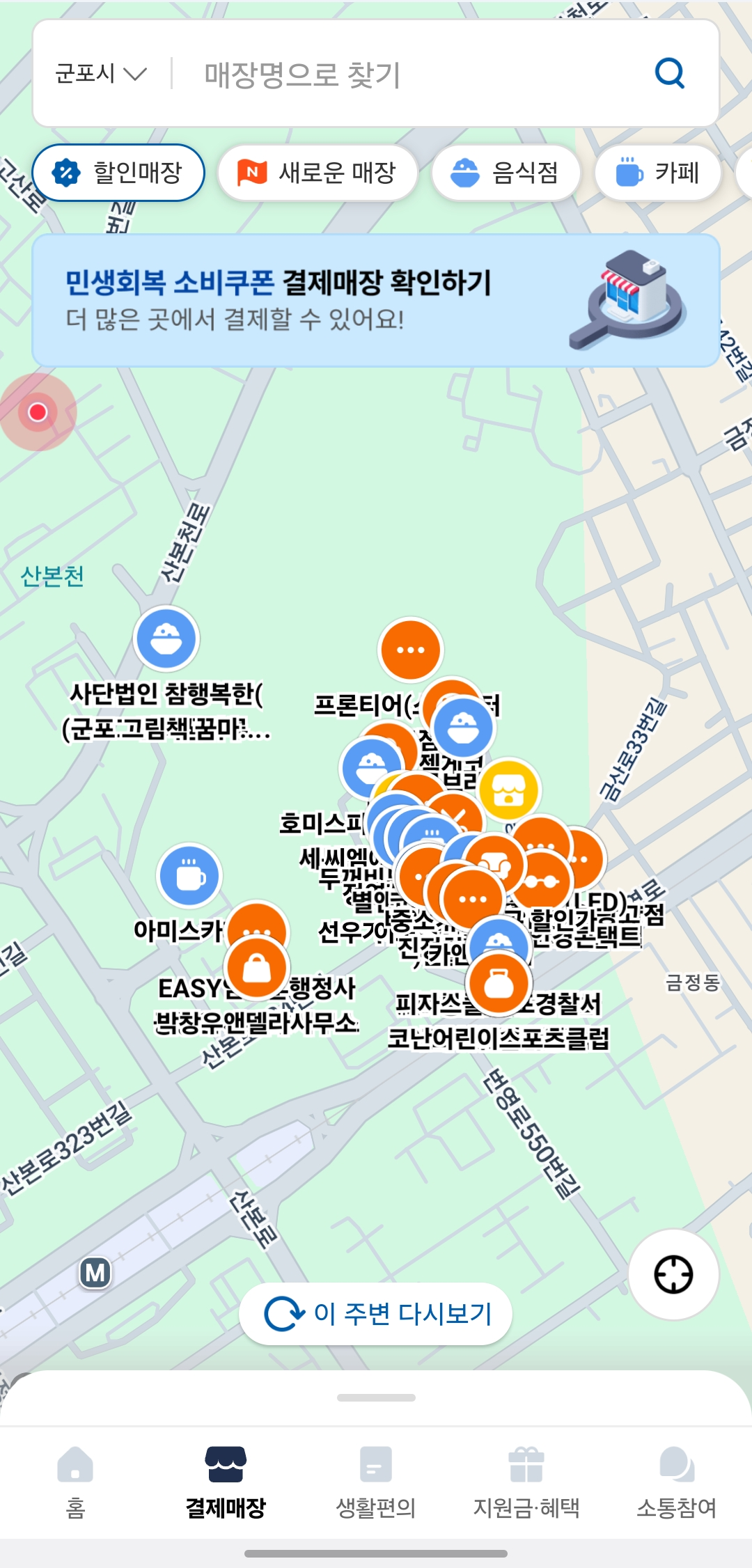 - 3. 사용처 앱에서 찾기: '경기지역화폐' 앱 메인 화면의 [지원금사용처] 또는 [결재매장]을 누르면 내 주변 모든 가맹점이 지도로 나옵니다.